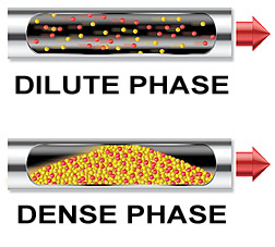 Bij dense phase transport is er sprake van het transporteren van een product onder hoge druk (5-6 bar) met een lage snelheid (3-15 m/s). Het product wordt middels een drukvat direct de transportleiding in gevoerd. Dense phase is uitermate geschikt voor transport over langere afstanden, tot ca. 500 m. en wordt voornamelijk toegepast bij abrasieve of kwetsbare producten, zoals suiker of gebrande koffiebonen.